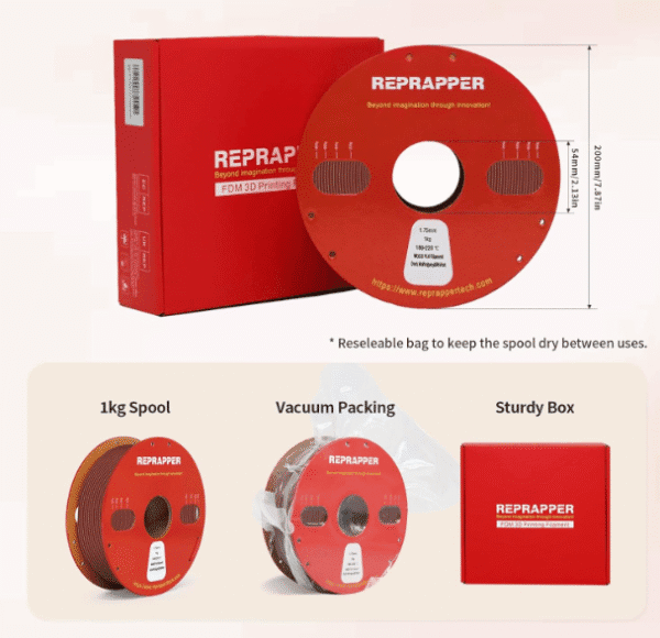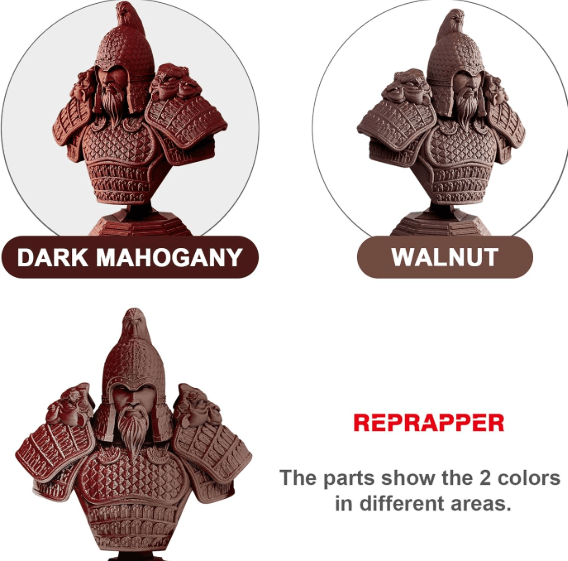 PLA especial de madera de doble color: el filamento de madera de doble color RepRapper contiene partículas de madera que lo hacen parecer, sentir y oler como madera real.